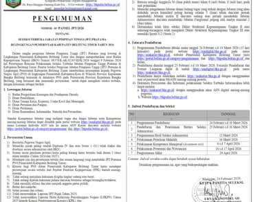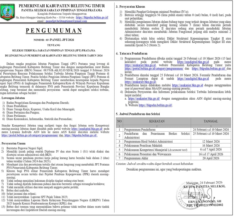 Pendaftaran resmi dilakukan 25 Februari – 10 Maret 2026 menggunakan akun MyASN masing-masing peserta. Dokumen persyaratan dan informasi lebih lanjut juga tersedia di portal BKN dan website BKPSDM Kabupaten Belitung Timur.